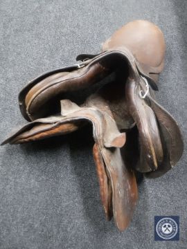 Two brown leather saddles