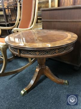 A circular mahogany occasional table on three-way pedestal support