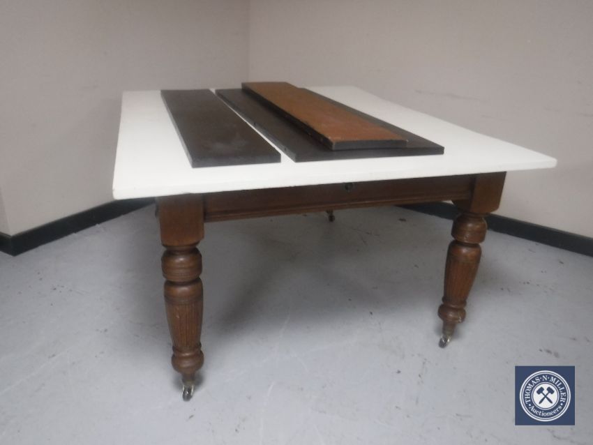 A Victorian mahogany wind out table with three leaves (top painted)