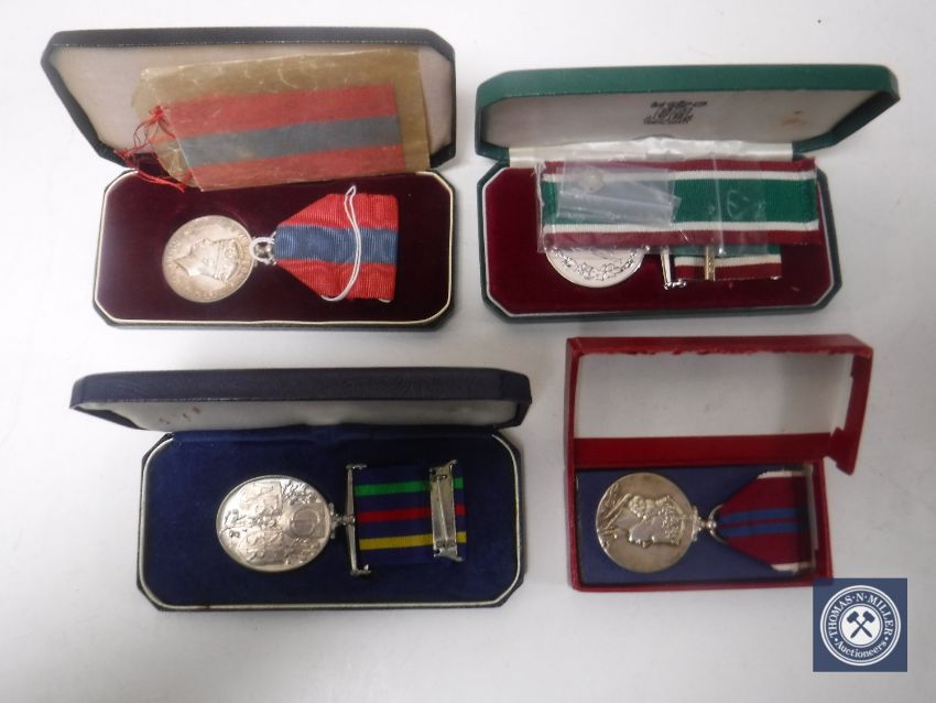 A collection of four medals on ribbons - Imperial service medal, long service defence medal, Women's voluntary service metal.