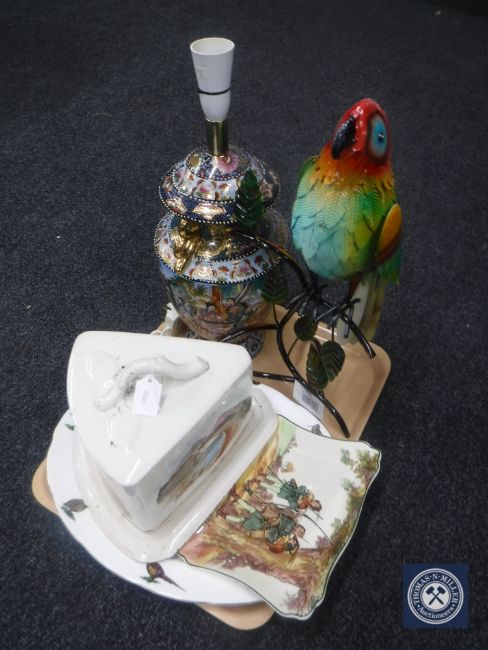 A tray of large butter dish, metal bird, ornate table lamp, Doulton dish etc