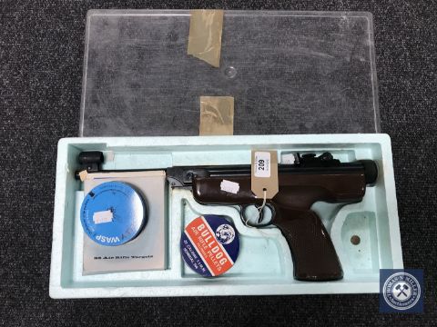 An "Original" model 5 break-barrel air pistol, .22 calibre, boxed, with two tins of pellets and a box of targets.