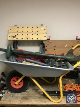 A wheel barrow containing assorted tools, gloves, electric strimmer, two folding work benches