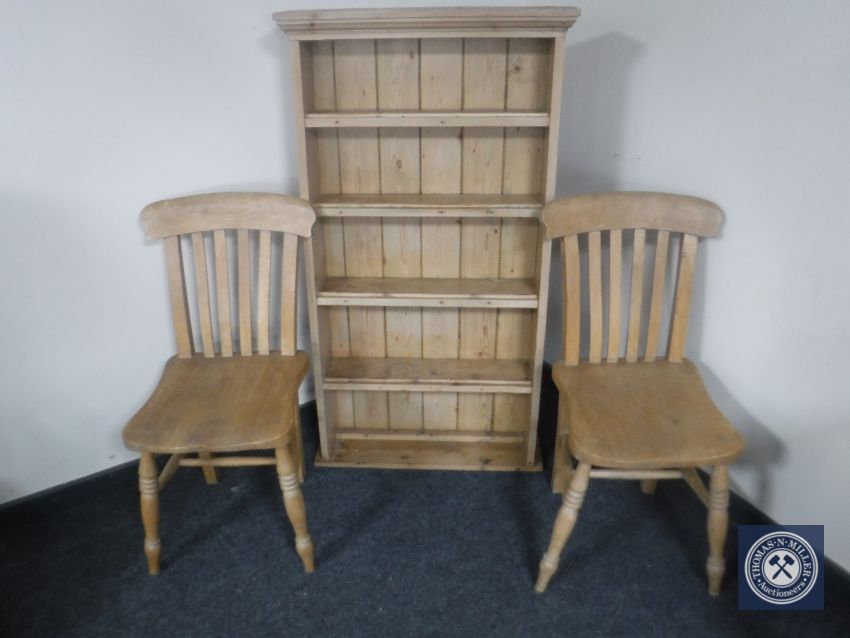 A pair of pine kitchen chairs together with a stripped pine bookshelf