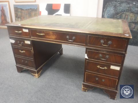 A 20th century mahogany twin pedestal writing desk with a green leather tooled panel