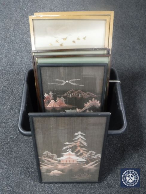 A box of seven framed Oriental silk panels and pictures