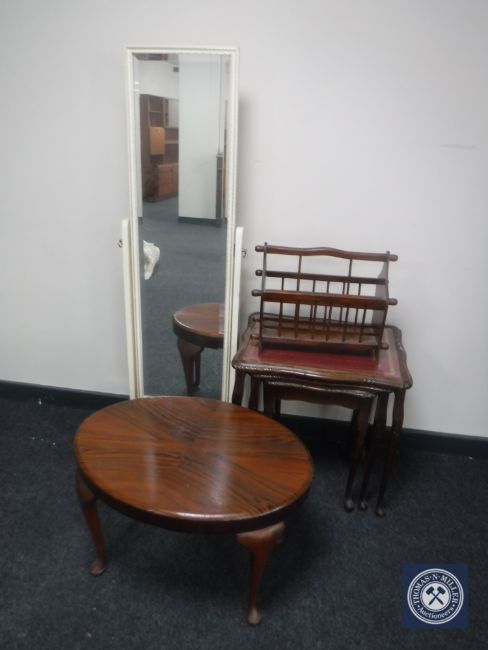 A nest of three mahogany glass and leather topped tables together with a mahogany magazine rack, oval occasional table and cream & gilt cheval mirror