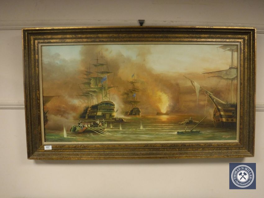 Continental school, naval battle, oil on canvas, signed Meyer, 99cm by 48cm
