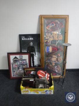 A leather cube together with a metal candle holder and box containing metal signs, Rolling stones wall canvas