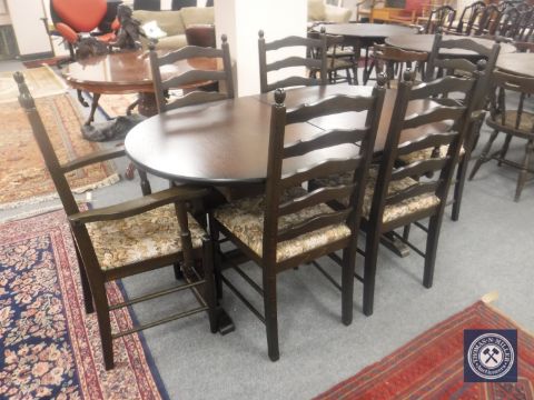 An oval oak extending dining table with leaf, together with a set of six ladder backed dining chairs