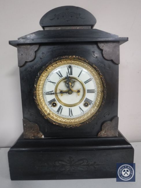 A Victorian black slate mantel clock with brass and enamelled dial
