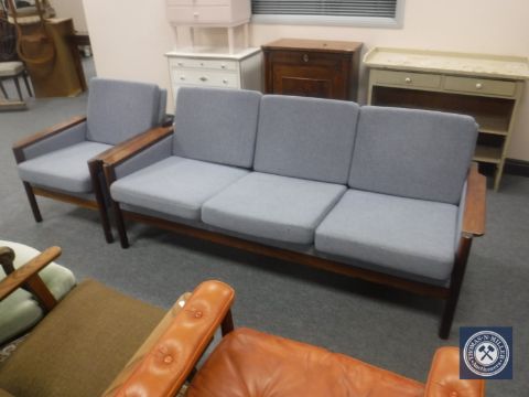 A mid twentieth century Danish wooden framed three seater settee and armchair