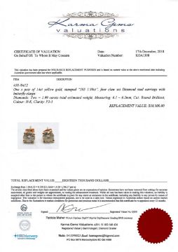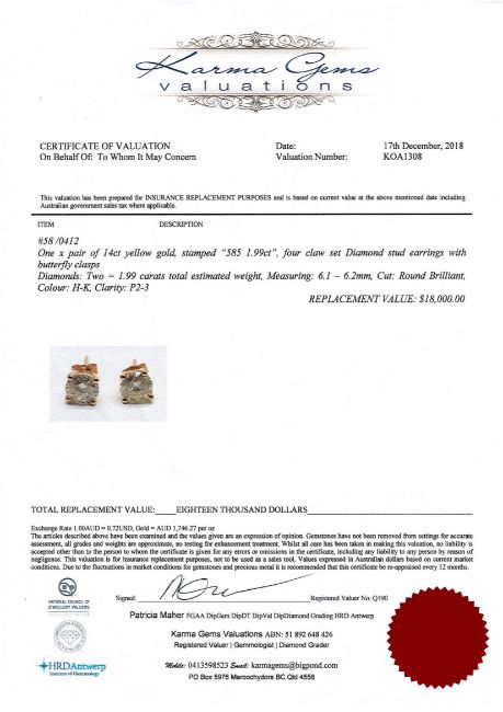 A pair of 14ct yellow gold diamond stud earrings, the two brilliant-cut diamonds weighing 1.99 carat in total, of P2-3 clarity and H-K colour, with certification.