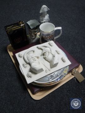 A tray of Wedgwood and Coalport wall plates depicting battle scenes, Danbury mint Waterloo tankard, Napoleon china cognac decanter, Toby jug etc.