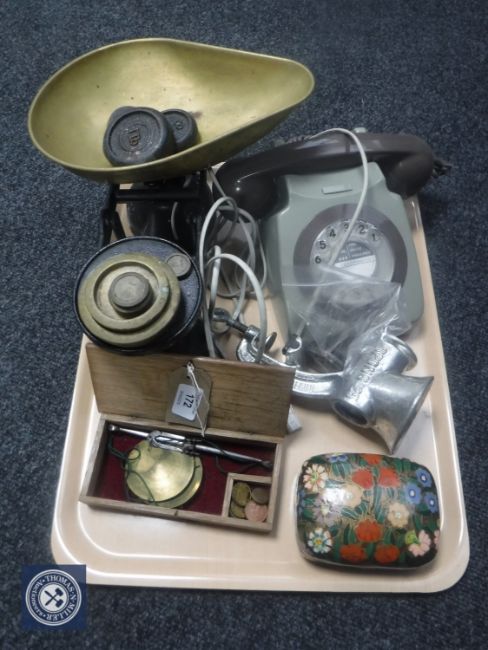 A tray of vintage telephone, vintage mincer, kitchen scales and weights, set of micro balance scales with weights