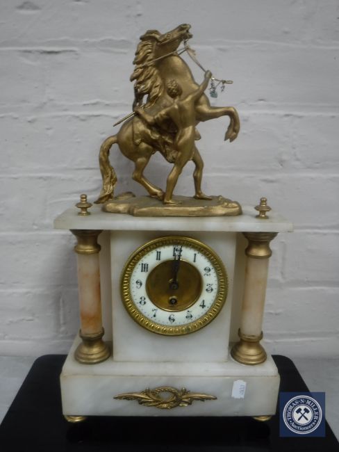 A gilt metal and alabaster mantel clock with enamel dial surmounted by a figure of a man with a horse