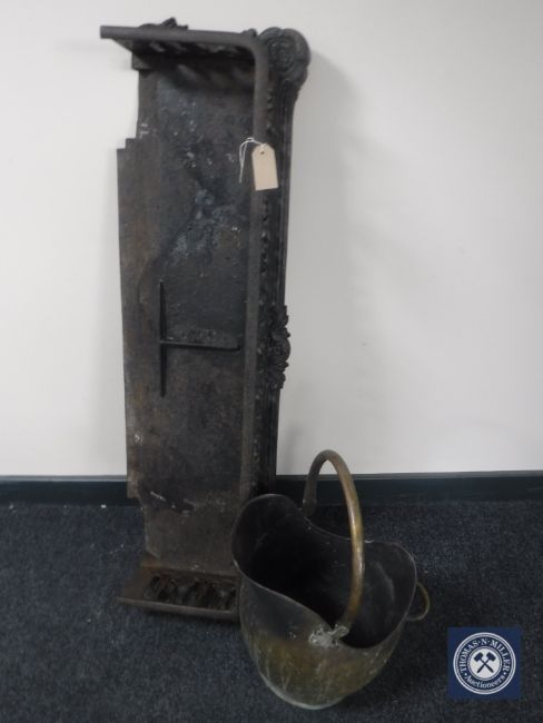 An antique cast iron fire curb together with a brass coal bucket