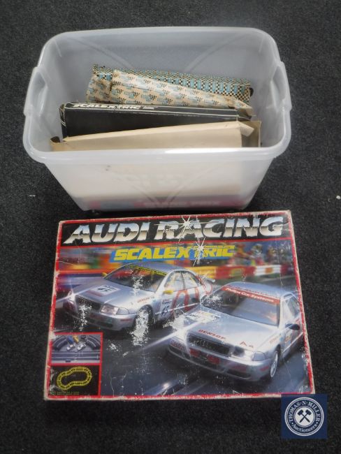 A boxed Scalextric set together with a box of assorted Scalextric track and accessories, bubble blaster etc.