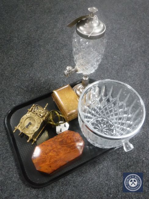 A tray of brass cased electric carriage clock together with a walnut trinket box, marble trinket box, cut glass and silver plated ice bucket and drinks dispenser