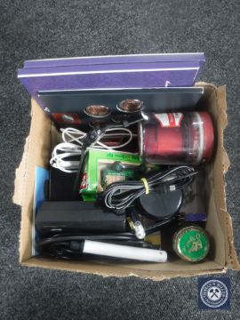 A box of wristwatches, hip flask, diecast car, commemorative coins and crowns, Battle of Waterloo coins etc.