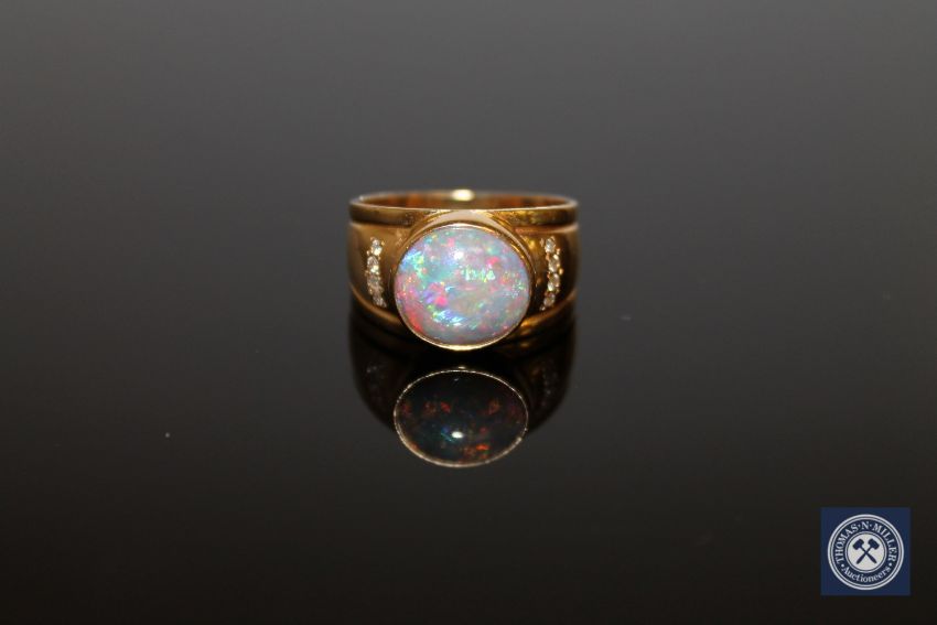 An 18ct gold opal and diamond ring, the oval cabochon white opal in a rubbed over setting, the shoulders set with eight brilliant-cut diamonds with a total weight of 0.08 carat, of G/H colour and VS-SI3 clarity, with certification, size Q1/2