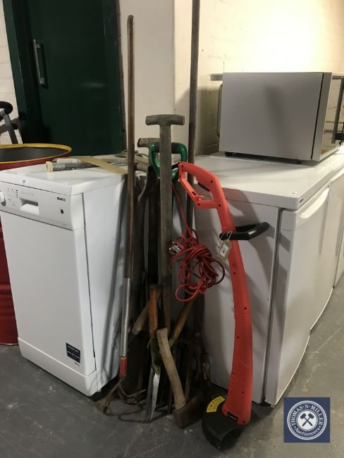 A bundle of assorted garden tools together with an electric strimmer