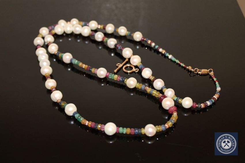 A cultured pearl, emerald, ruby and sapphire bead necklace, with gold clasp, length 84cm