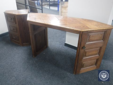 A reclaimed pine kneehole desk fitted two cupboards, together with matching three drawer corner chest