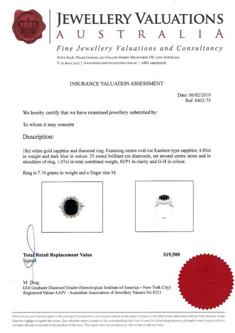 An 18ct white gold sapphire and diamond cluster ring, the oval-cut Kashmir sapphire weighing 4.85 carats, with twenty-five brilliant-cut diamonds weighing 1.07 carat in total, of SI/P1 clarity and G/H colour, with certification, size M