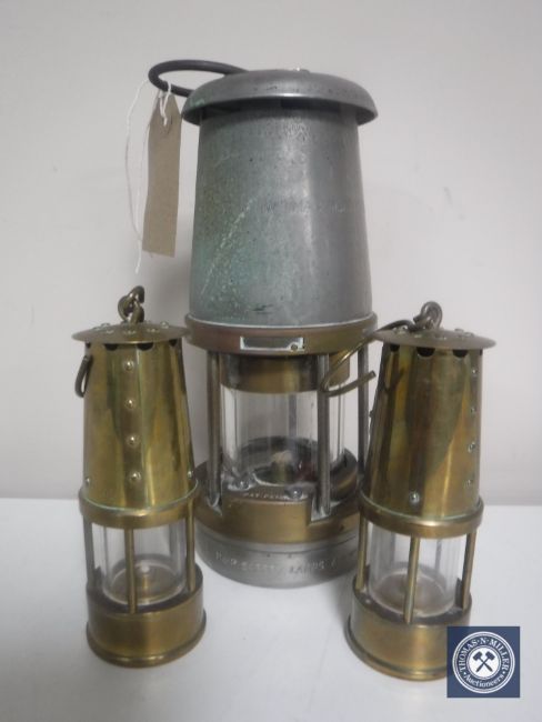 A chrome and brass Wolfe Type E miner's lamp by Morris Limited of Sheffield and two further miniature brass oil lamps