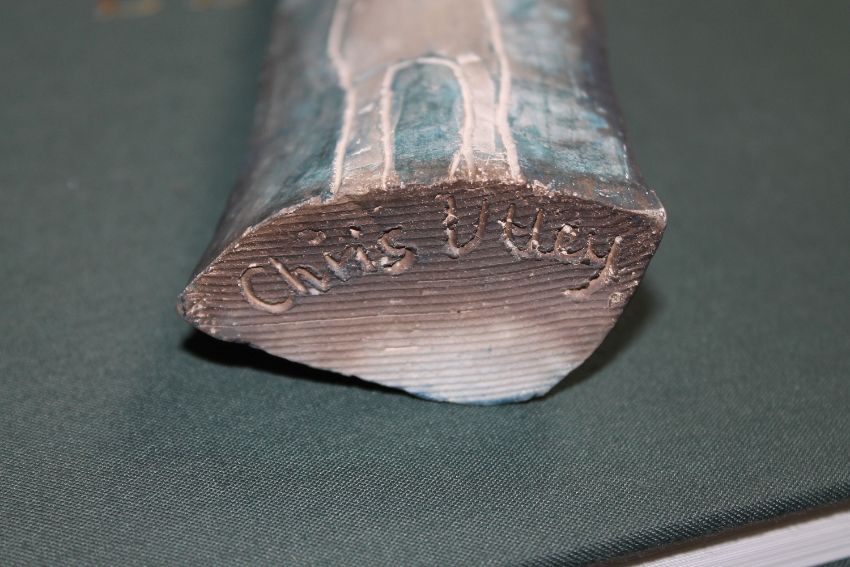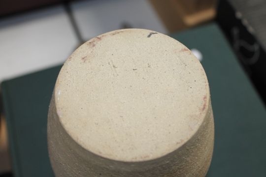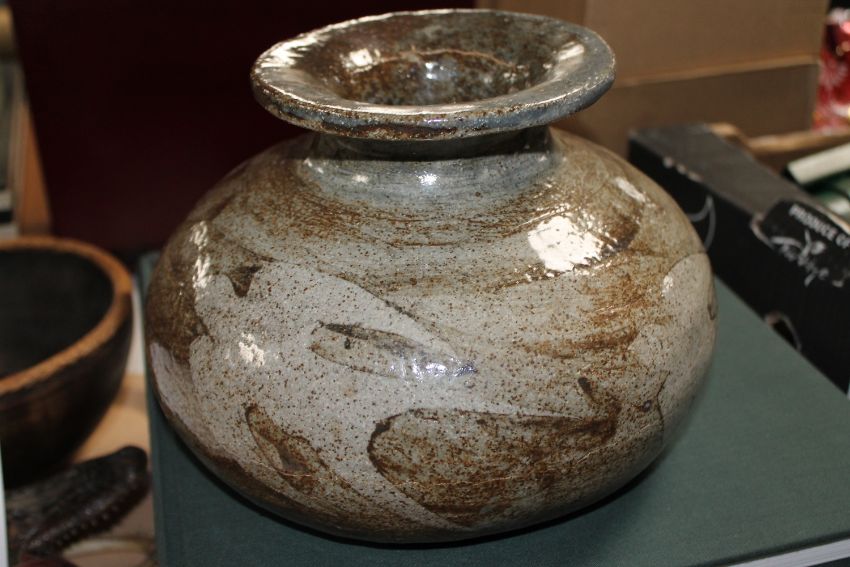A tray of studio pottery vases and bowls, tea cup and mug, commemorative mug etc