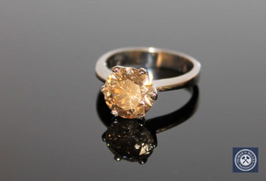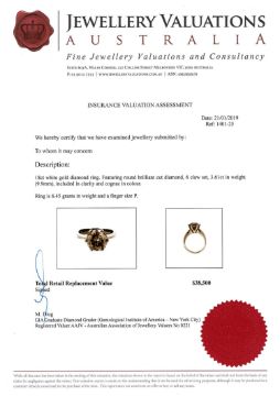 An 18ct white gold solitaire diamond ring, the brilliant-cut, cognac coloured diamond weighing 3.61 carats, with a six-claw setting upon a plain shank, with certification, size P