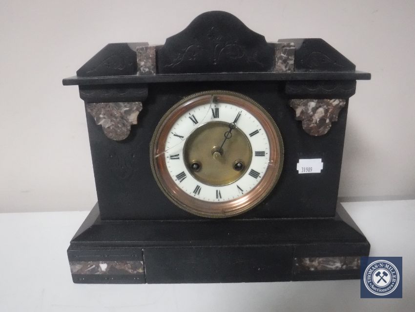 A Victorian slate brass mantel clock with brass and enamelled dial (glass cracked)