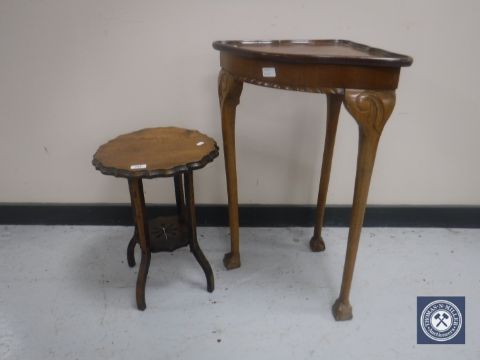 An oak pie crust edge plant stand together with a walnut corner table on claw and ball feet