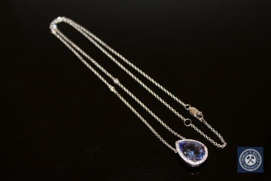 An 18ct white gold tanzanite and diamond necklace, the pear-cut violet-blue tanzanite weighing 8.60 carats, with thirty-four brilliant-cut diamonds weighing 0.40 carat in total, of P1 clarity and F-H colour, with certification, chain length 50cm
