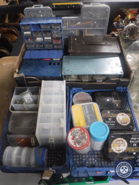A box and two crates containing ammunition box and storage boxes containing screws and fittings