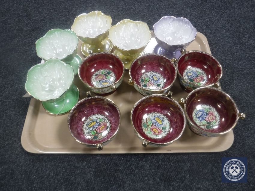 A tray of five Maling lustre grapefruit dishes together with six Maling Peony Rose sundae dishes