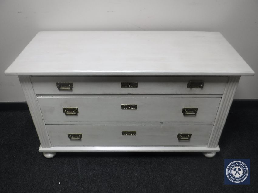 A continental oak painted three drawer chest on bun feet