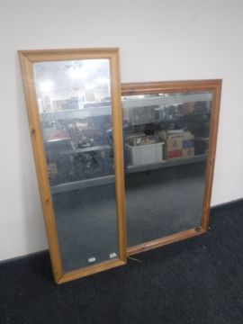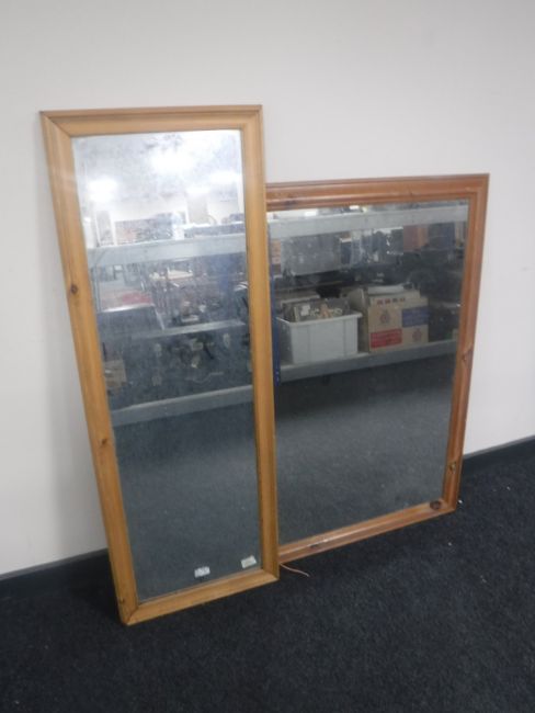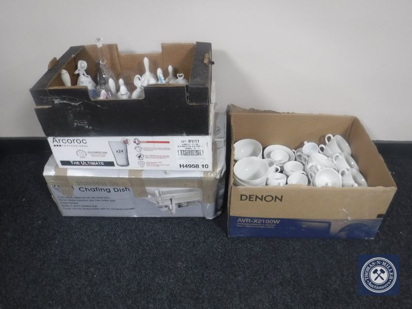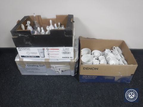 A boxed stainless steel chafing dish together with a box containing Arcoroc glasses, boxes of assorted tea and coffee cups, box of china and glass bells and two pine framed mirrors