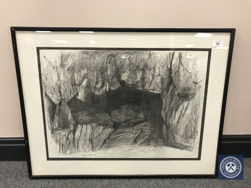Donald James White : Songia Cave, Crete, charcoal study, signed with initials, dated 17/7/87, 42 cm x 60 cm.