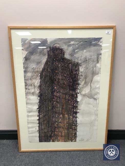 Donald James White : Scaffolded Building, watercolour, signed with initials, dated 4.7.90, 96 cm x 65 cm, framed.