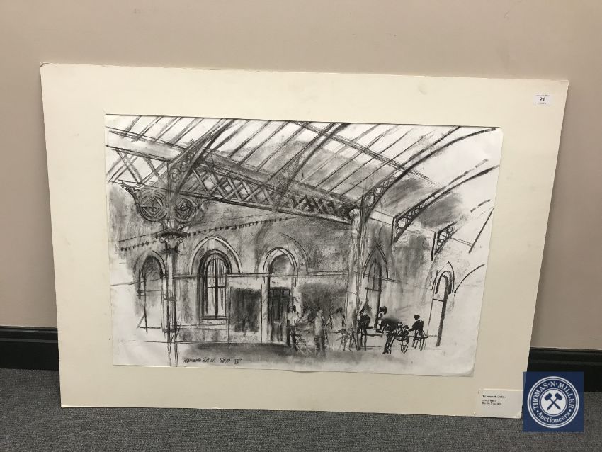 Donald James White : Tynemouth Station, charcoal study, signed with initials, 16/10/01, 58 cm x 84 cm, un-framed.