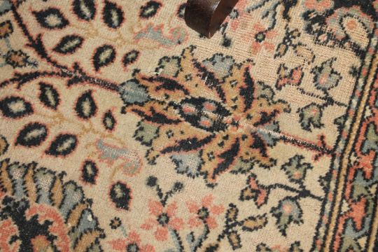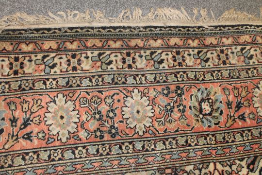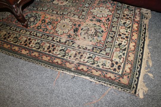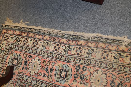 Pile worn thin. Some areas with more significant patches of wear. Some losses to fringes at either end. Fraying to selvedges in some areas. Pile quite dirty. See additional images.