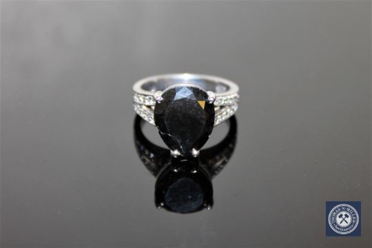 An 18ct white gold solitaire diamond ring, the pear-cut, colour-enhanced black diamond weighing 6.03 carats within a claw setting, the shoulders set with twenty-four brilliant cut diamonds totalling 0.20 carat, of SI clarity and G-H colour, with certification, size M. NB: Prominent crack visible to the surface of the diamond.