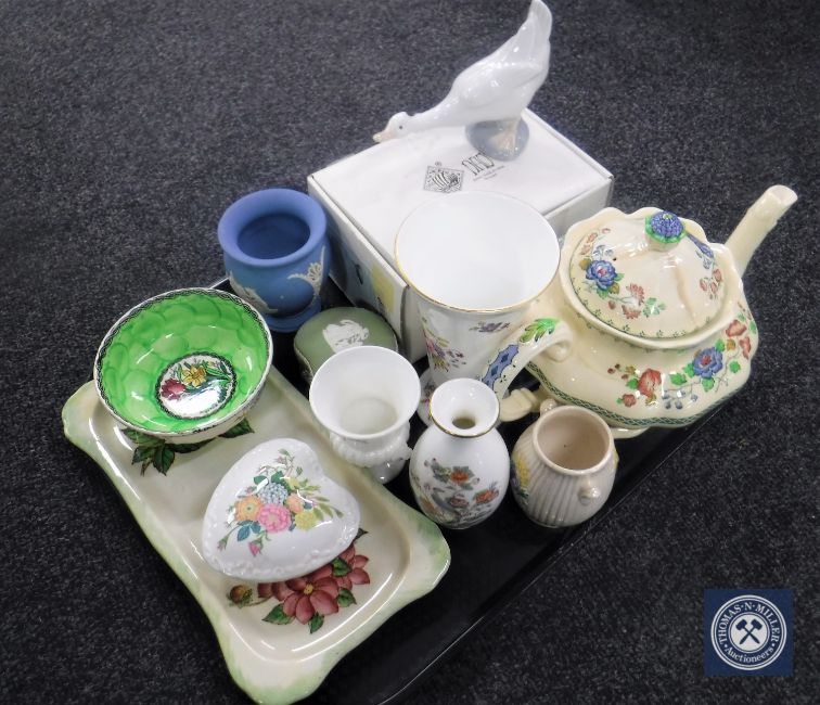 A tray of boxed Nao figure of a duck, Wedgwood Jasperware, Maling trinket dish and bowl, Adam Strathmere floral teapot