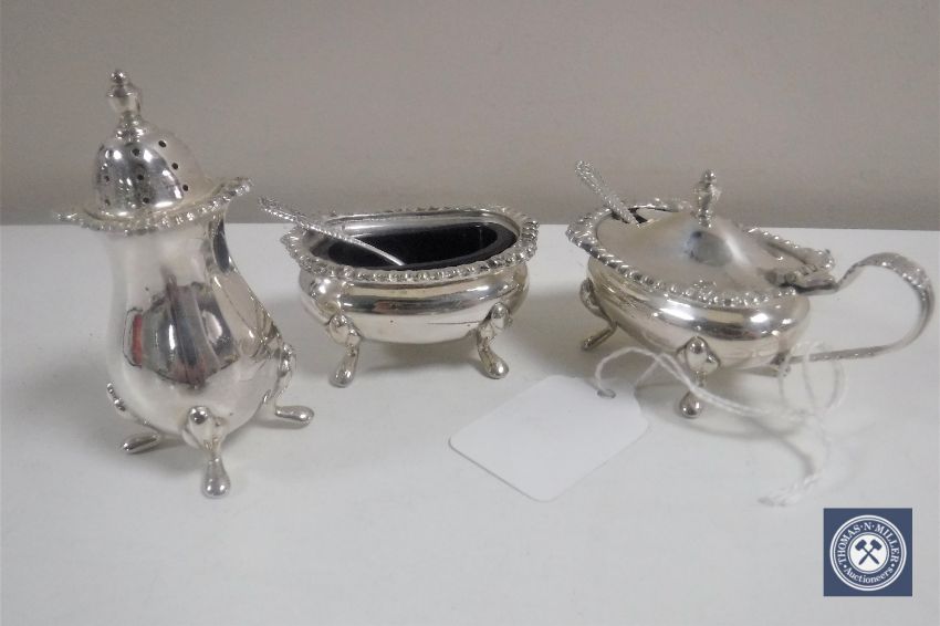 A silver pepper pot, silver salt with liner and spoon and a silver mustard pot with liner and spoon