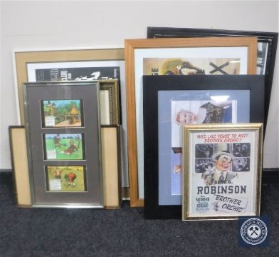 A box of eleven assorted framed pictures and prints including Marilyn Monroe and Beatles montages, boxing montage, poster etc