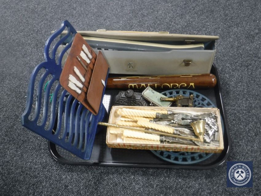 A tray of cased Hohner Melodica, tourist truncheon, fish cutlery, cast iron trivet with menu stand, etc