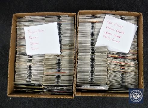 Two boxes containing 7" singles including Rolling Stones, Beatles, Sex Pistols, Queen, David Bowie etc