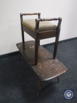 An Ercol coffee table and an Edwardian piano stool